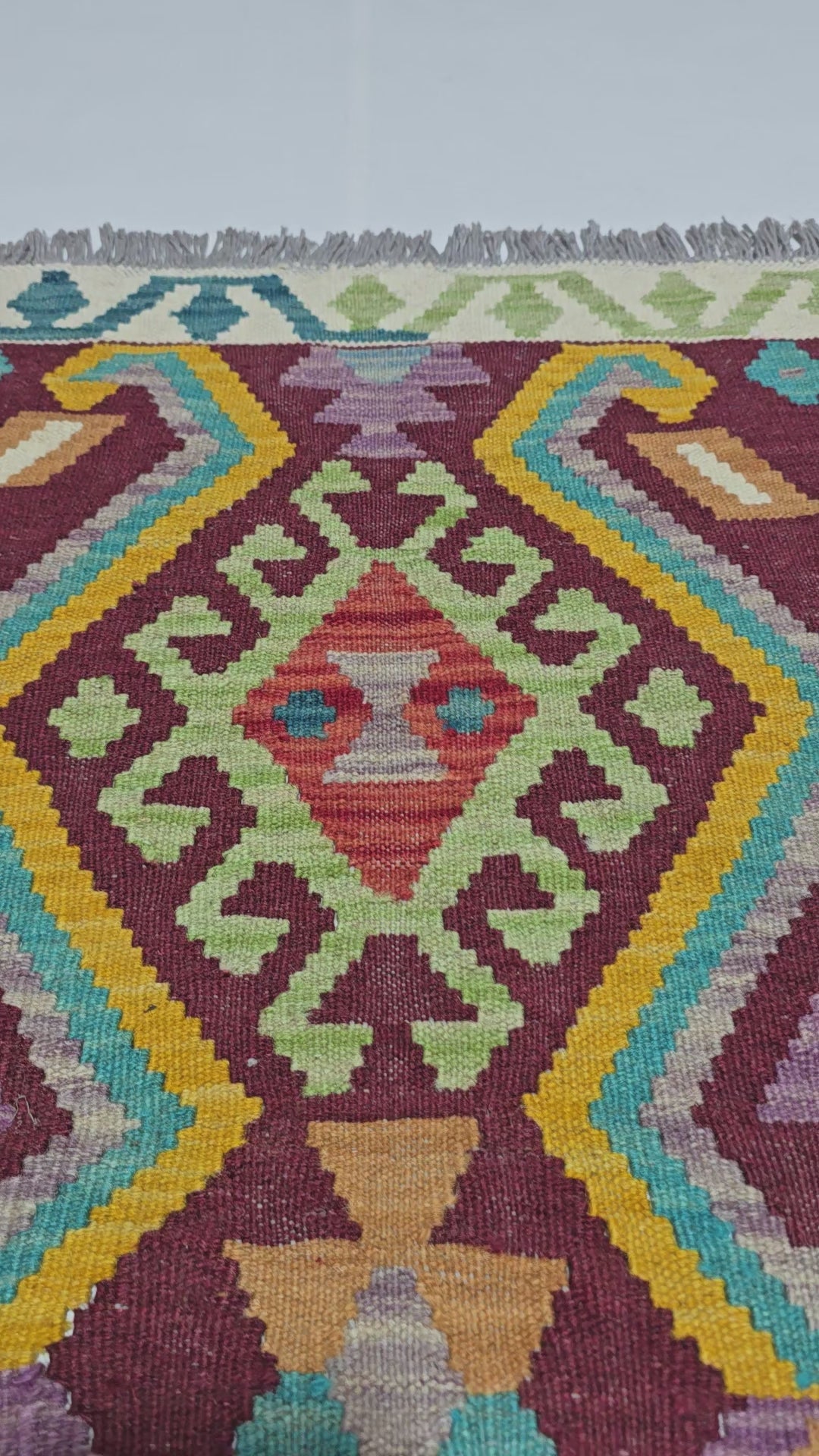 Deze traditionele, handgeweven kelim uit Afghanistan is met zorg door ons geselecteerd op zowel kwaliteit als design. Afghaanse kelims staan bekend om hun levendige kleuren, verfijnde patronen en hoge kwaliteit. Elk vloerkleed wordt met de hand vervaardigd door ervaren ambachtslieden, die eeuwenoude weeftechnieken van generatie op generatie doorgeven. Breng warmte, karakter en cultuur in je interieur met deze authentieke en tijdloze kelim.