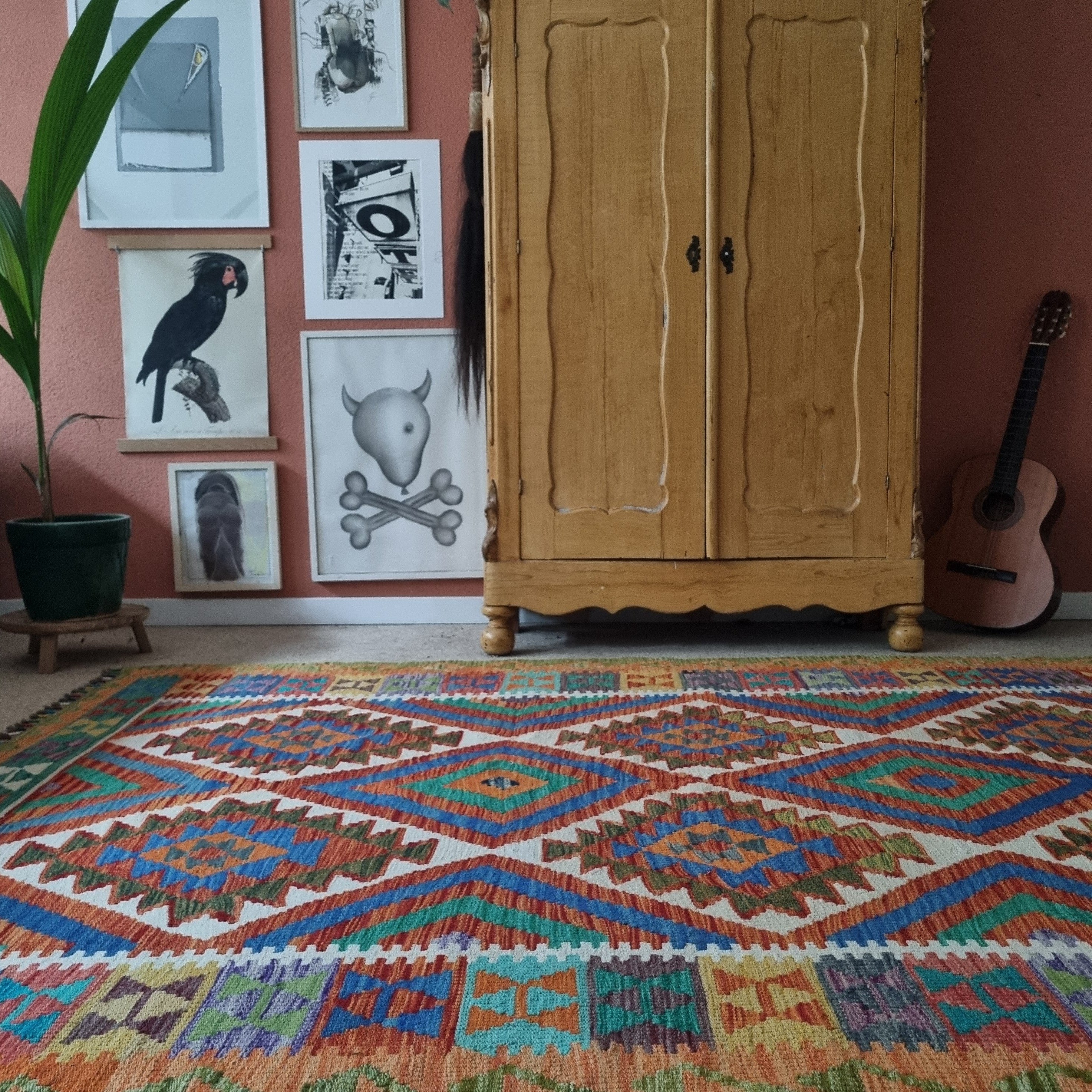Unsere Kelim Teppich-Kollektion ist vielseitig und mit viel Liebe zum Detail zusammengestellt – passend zu ganz unterschiedlichen Einrichtungsstilen. Ob du ein ausdrucksstarkes Statement setzen möchtest oder eher eine dezente Variante in sanften Pastelltönen suchst: Jeder Teppich ist handgewebt von erfahrenen Kunsthandwerkern in Nordafghanistan und verkörpert Generationen von Tradition und Handwerkskunst.