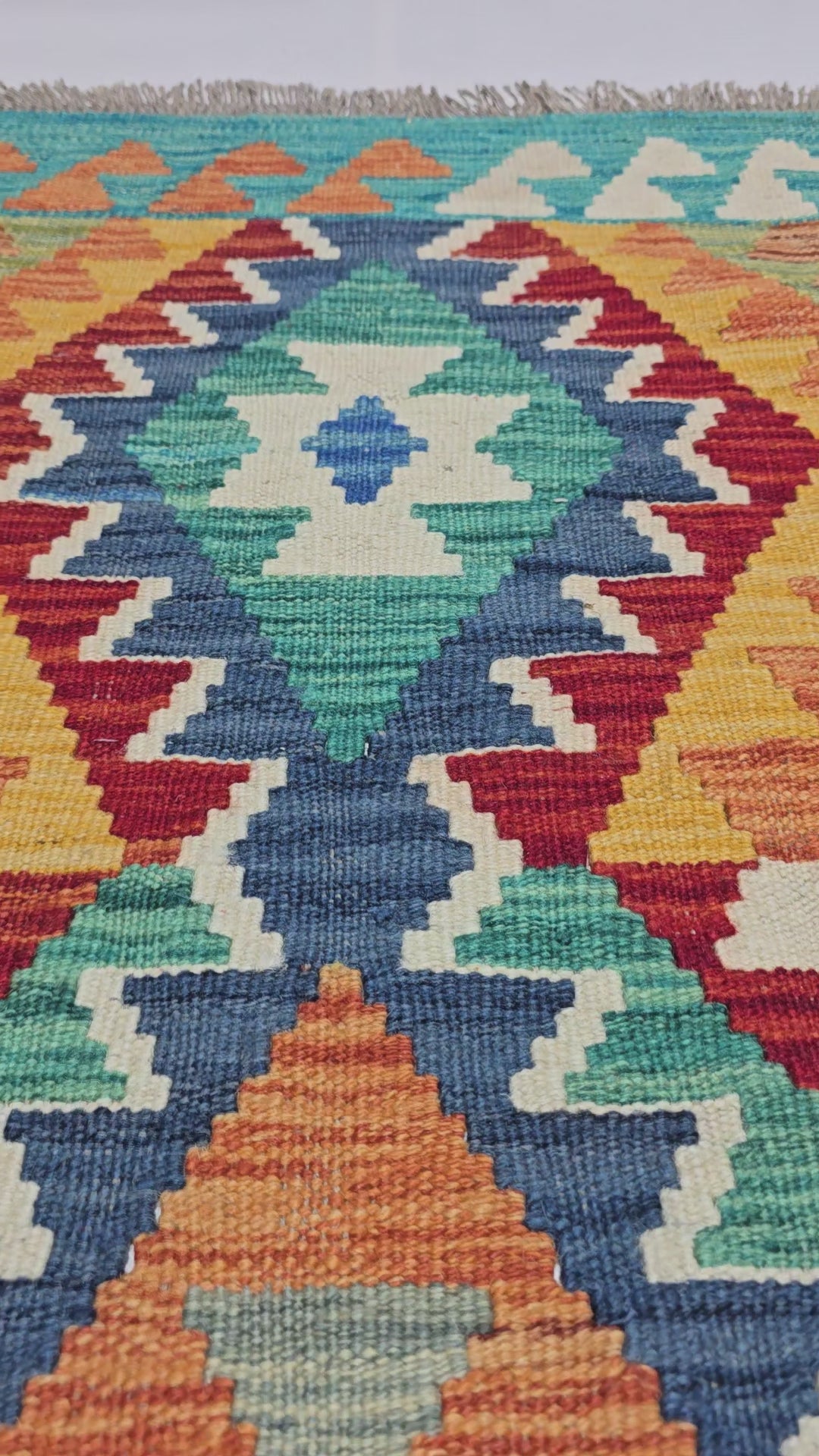 Erlebe die reiche Kultur Afghanistans und ihre beeindruckende Handwerkskunst mit einem traditionellen Kelim Teppich. Dieser Teppich bringt Farbe, Wärme und Struktur in dein Zuhause. Wir wählen jedes Stück sorgfältig aus – so stellen wir sicher, dass jeder Kelim Teppich echte afghanische Handwerkskunst widerspiegelt. Mit kräftigen geometrischen Mustern, leuchtenden Farben und der traditionellen Schlitzwebtechnik bringt dieses flachgewebte Schmuckstück über 1.500 Jahre Geschichte in dein Zuhause.