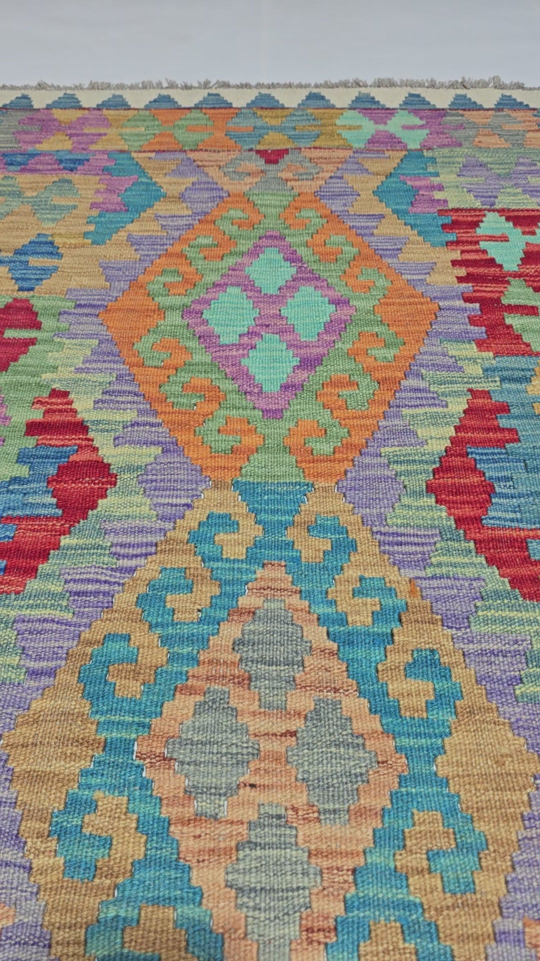 Erlebe die reiche Kultur Afghanistans und ihre beeindruckende Handwerkskunst mit einem traditionellen Kelim Teppich. Dieser Teppich bringt Farbe, Wärme und Struktur in dein Zuhause. Wir wählen jedes Stück sorgfältig aus – so stellen wir sicher, dass jeder Kelim Teppich echte afghanische Handwerkskunst widerspiegelt. Mit kräftigen geometrischen Mustern, leuchtenden Farben und der traditionellen Schlitzwebtechnik bringt dieses flachgewebte Schmuckstück über 1.500 Jahre Geschichte in dein Zuhause.